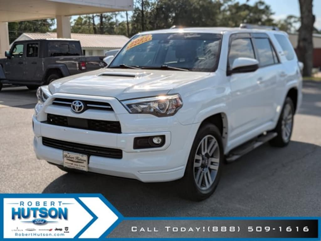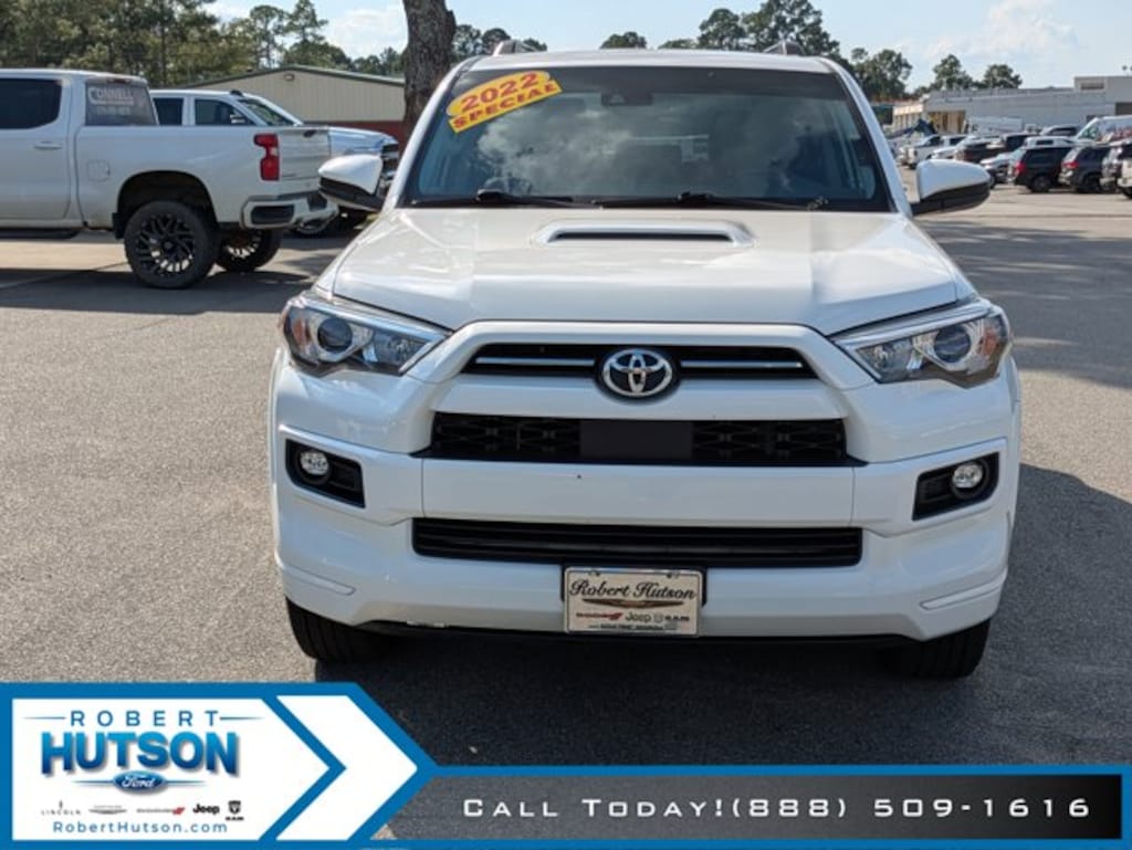 CARFAX One-Owner. White 2022 Toyota 4Runner TRD Sport 4.0L V6 DOHC 24V 5-Speed with ECT 4WD 3.727 Axle Ratio, 4-Wheel Disc Brakes, 8 Speakers, ABS brakes, Air Conditioning, Alloy wheels, AM/FM radio: SiriusXM, Anti-whiplash front head restraints, Apple CarPlay/Android Auto, Auto High-beam Headlights, Black Roof Rails, Brake assist, Bumpers: body-color, Driver door bin, Driver vanity mirror, Dual front impact airbags, Dual front side impact airbags, Electronic Stability Control, Emergency communication system: Safety Connect with 1-year trial, Exterior Parking Camera Rear, Front anti-roll bar, Front Bucket Seats, Front Center Armrest, Front fog lights, Front reading lights, Front wheel independent suspension, Heated door mirrors, Illuminated entry, Knee airbag, Leather Shift Knob, Leather steering wheel, Low tire pressure warning, Occupant sensing airbag, Outside temperature display, Overhead airbag, Overhead console, Panic alarm, Passenger door bin, Passenger vanity mirror, Power door mirrors, Power driver seat, Power steering, Power windows, Radio: Audio, Rear anti-roll bar, Rear seat center armrest, Rear window defroster, Rear window wiper, Remote keyless entry, Security system, Shift Knob, SofTex Seat Trim, Speed control, Speed-sensing steering, Split folding rear seat, Spoiler, Steering wheel mounted audio controls, Tachometer, Telescoping steering wheel, Tilt steering wheel, Traction control, TRD Sport Badge, TRD Sport Carpet Floor Mats, TRD Sport Package, Trip computer, Variably intermittent wipers, Wheels: 20" Dark Gray Metallic Machined-Face Alloy.